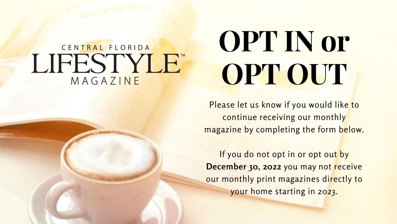 Let us know if you are still interested in receiving the physical copy of the Central Florida Lifestyle Magazine.